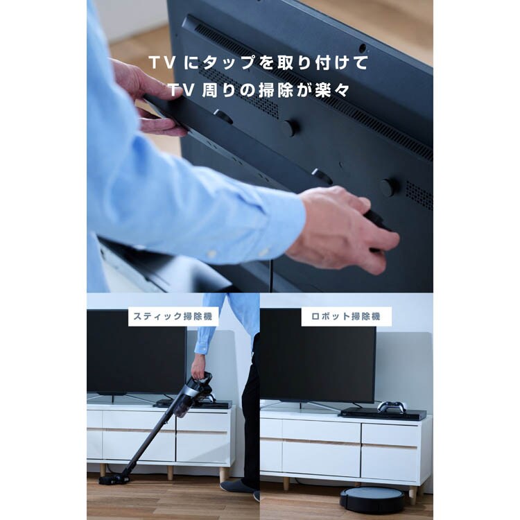 ●テレビやディスプレイの裏にあるVESA規格の取り付け穴を活用して、電源タップの設置が可能。床にタップを置かずに済むので、見た目もすっきり。掃除がしやすくなることで、ホコリも溜まりにくくなります。