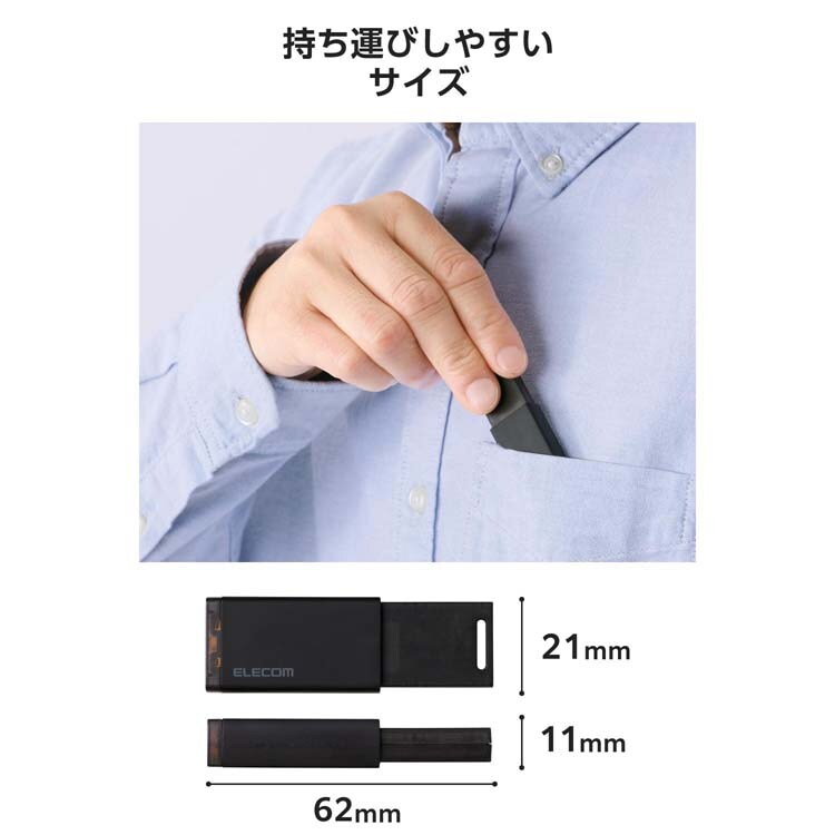 ●開封後、挿すだけですぐに使用可能。出荷時にexFAT形式でフォーマット済みのため、iPhone、Androidスマートフォン、Windowsパソコン、Macなどで挿してそのまますぐに使えます。ケーブルやアダプターなどを別途用意する必要はありません。