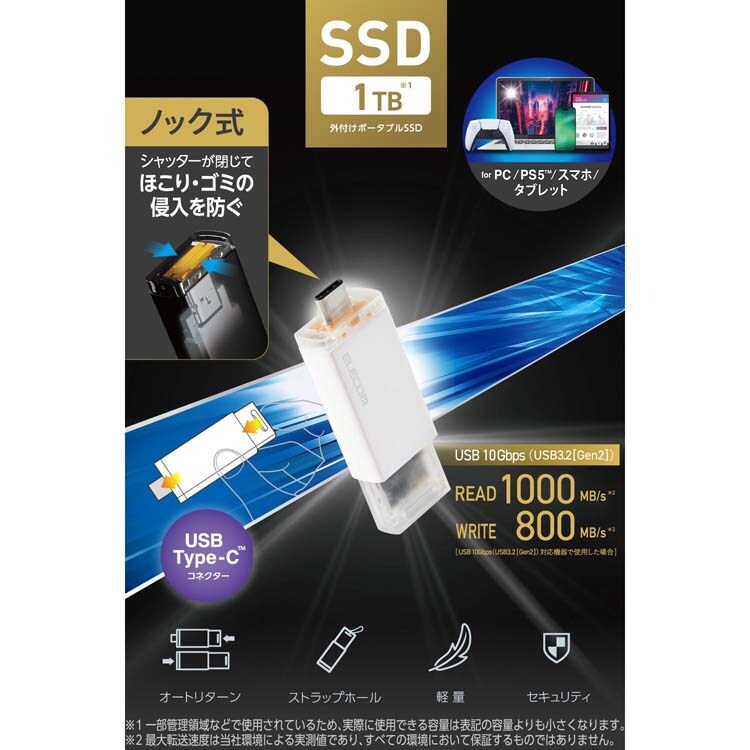 エレコム SSD 外付け 1TB USB3.2 Gen2 読込最大1000MB/秒 ノック式 高速 ホワイト (1個)