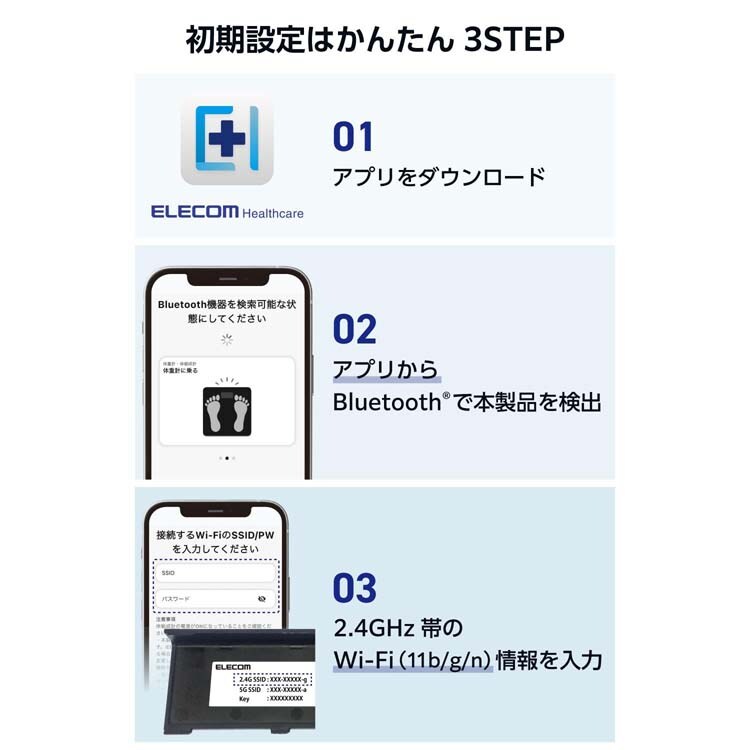●本製品とスマートフォンをBluetooth接続してアプリ初期設定を行い、専用アプリへのデータ転送・自動保存はWi-Fi通信で行います。手軽にアプリに接続して初期設定ができ、毎日の測定時も本体に乗るだけで簡単に記録できます。