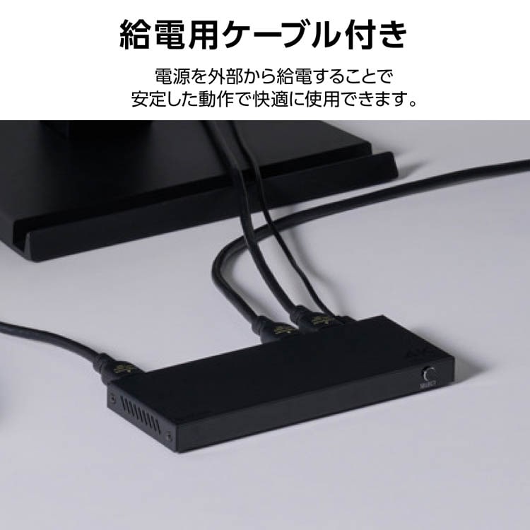 ●本体のボタンもしくは付属のリモコンでポート切り替えが可能。離れた場所からの操作も可能です。