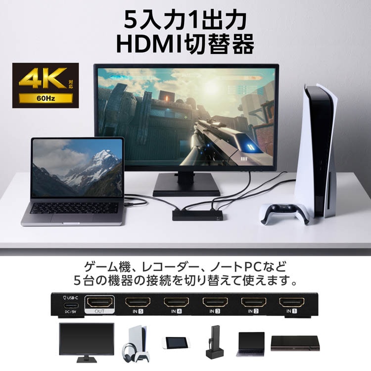 ●最大5台のHDMI(R)機器を接続し、ボタンを押すだけで1つのディスプレイで映画やゲームを楽しめるHDMI切替器です。
