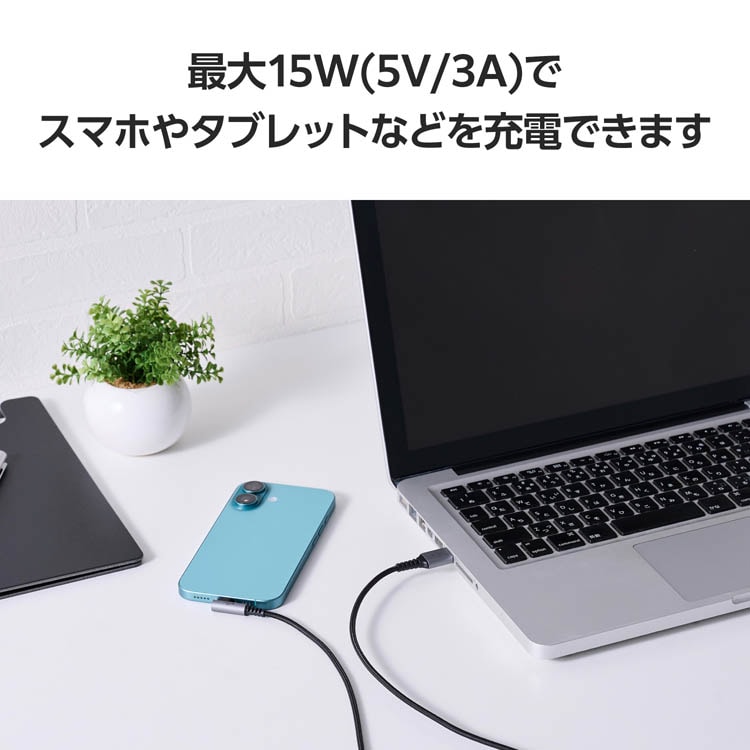 ●USB-A端子を搭載しているパソコンおよび充電器・モバイルバッテリーなどに、USB Type-C(TM)端子を搭載しているスマートフォンやタブレットを接続し、充電やデータ転送ができるHi-Speed USB(USB2.0)ケーブルです。