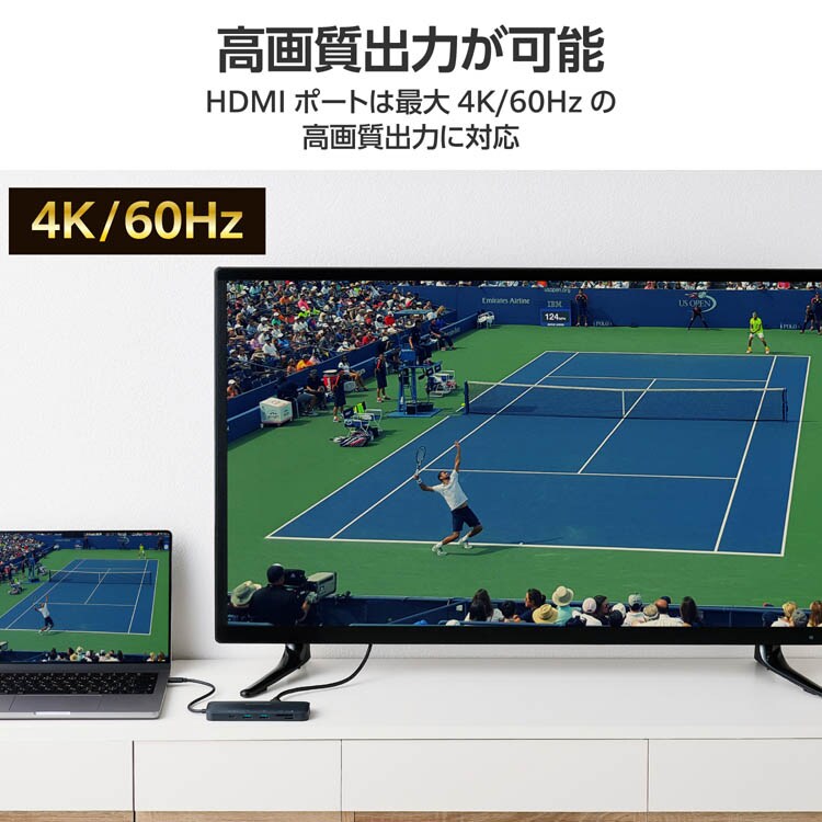 ●USB Type-C(TM)コネクターでパソコンに接続し、USB機器やHDMI(R)ディスプレイを接続できるドッキングステーションです。USB Type-C搭載パソコンに、ケーブル1本で必要な周辺機器を一括接続できます。