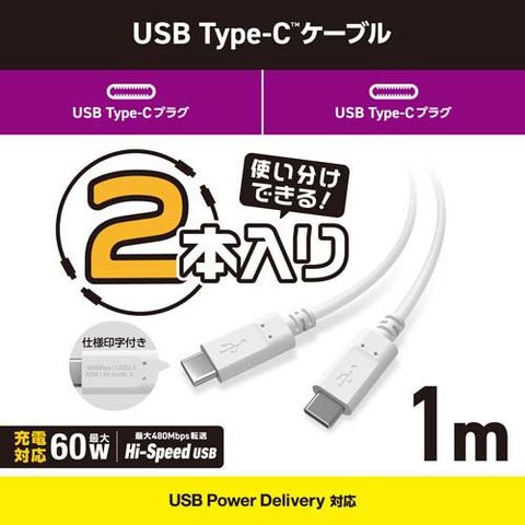 エレコム Type-C ケーブル (USB-C to C) 1m PD 60W 急速充電 ホワイト (2本)