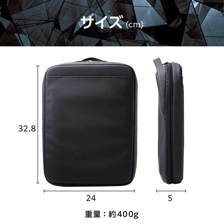 | 外形寸法:W約240mm×D約50mm×H約328mm ※ハンドル含まず 内寸:W約220mm×D約18mm×H約308mm ※13.3インチノートパソコンの参考収納寸法 対応モデル:13.3インチまでのノートパソコン パソコン収納部内寸備考:※W約220mm×D約18mm×H約308mmが対応端末サイズとして最大です。これより小さい寸法の端末の収納に対応します。一部の端末は対応しない場合があり、保証の限りではありません。最新の対応情報はエレコムホームページでご確認ください。 ポケット(気室内):オープンポケット(ストレッチメッシュ)×2、オープンポケット×2 ポケット(背面):オープンポケット×1 カラー:ブラック 材質:ポリエステル、ポリウレタン 重量:約400g |