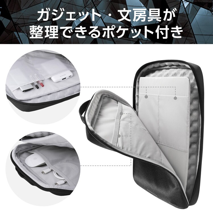 ●本体内装には、マウスやケーブルなどの周辺機器を整理して収納できるストレッチメッシュ素材のオープンポケットを2つ備えています。