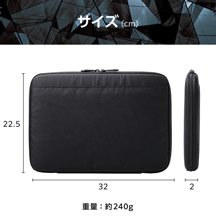 | 外形寸法:W約320mm×D約20mm×H約225mm 内寸:W約300mm×D約18mm×H約205mm ※11.6インチノートパソコンの参考収納寸法 対応モデル:11.6インチまでのノートパソコン パソコン収納部内寸備考:※W約300mm×D約18mm×H約205mmが対応端末サイズとして最大です。これより小さい寸法の端末の収納に対応します。一部の端末は対応しない場合があり、保証の限りではありません。最新の対応情報はエレコムホームページでご確認ください。 ポケット(背面):オープンポケット×1 カラー:ブラック 材質:ポリエステル、ポリウレタン 重量:約240g 表面加工:撥水加工(表生地) |