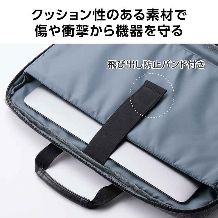 ●ノートパソコン用オープンポケットには、飛び出し防止バンドが付いています。