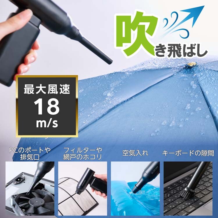 ●パソコンの画面やキーボードの隙間にあるホコリやゴミなどを強力な風で吹き飛ばし、パソコン周りをきれいに掃除できる電動エアダスターです。