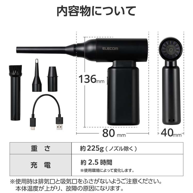 【エレコム 電動エアダスター ブロワー USB充電式 ノズル付属 強力小型 ブラックの商品詳細】