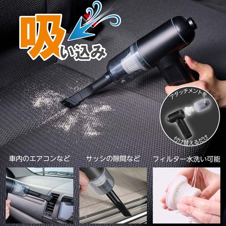 ●アタッチメントを付け換えるだけで、ハンディ掃除機としても使える2WAY仕様です。車内のエアコンなどの掃除にも便利です。