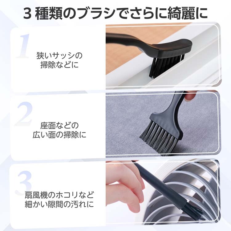 ●付属のブラシを使い分けることで、座面などの広い面の掃除から扇風機のホコリなど細い隙間の汚れまで、しっかり取り除けます。