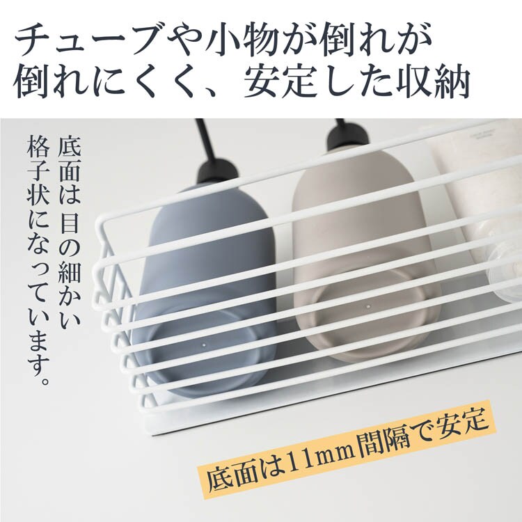 ●底面のワイヤーは11mm間隔になっていて、チューブや小物が倒れにくく、安定して収納できます。
