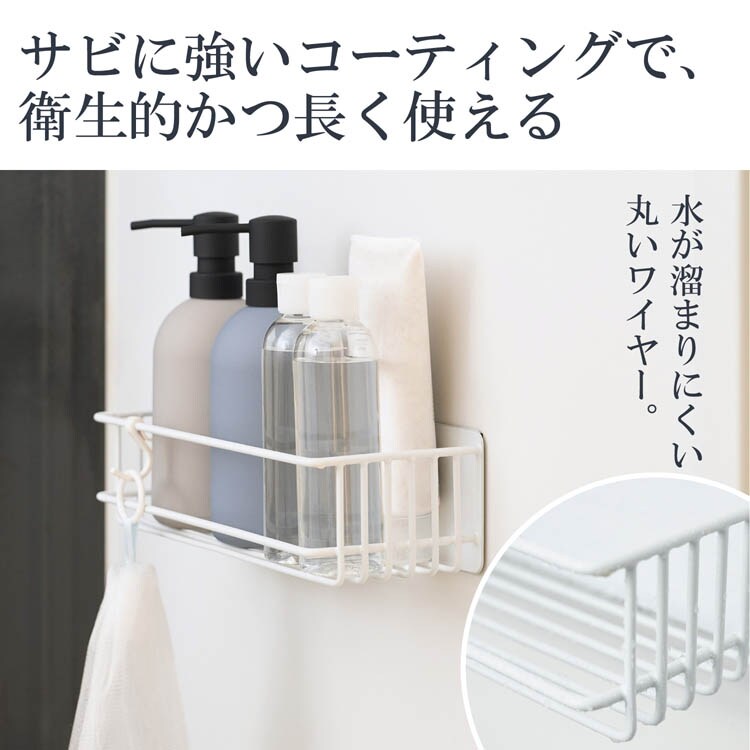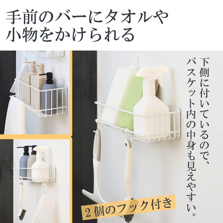 ●2個のフック付き。洗顔ネットや掃除用小物を吊り下げて収納でき、浴室が整理され使いやすくなります。
