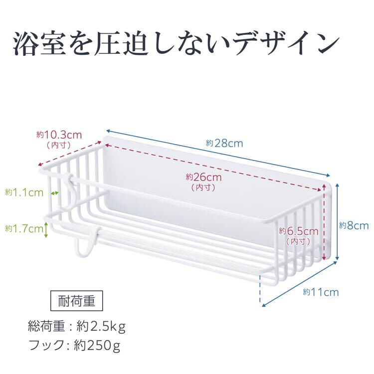 | ・サイズ:幅約280mm×奥行約110mm×高さ約80mm、収納内寸:幅約260mm×奥行約103mm×高さ約65mm ・重量:約0.6kg ・材質:スチール(PEコーティング)、マグネット、シリコン、ナイロン ・耐荷重:本体総荷重:約2.5kg、フック:約250g ・内容物:本体×1、フック×2 ・カラー:ホワイト |