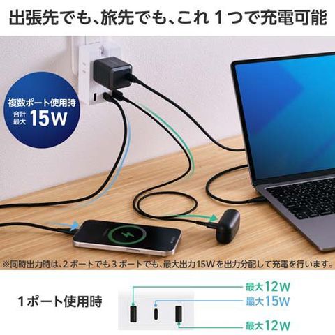 ●USB-Aポート×2、USB Type-C(TM)ポート×1を搭載。USB Type-Cポートからは最大15Wでの充電が可能です。