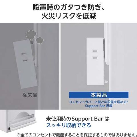●設置時にコンセントカバーと壁との段差でガタつき、プラグが抜けそうになるのを防ぐ「Support Bar」を搭載。段差を埋めることでプラグの根元にホコリが溜まりにくくなり、火災のリスクを低減します。可動式のため、未使用時はスッキリ収納できます。