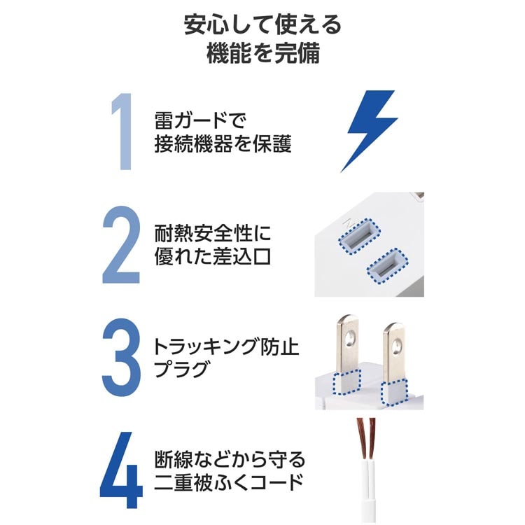●本体筐体には高い難燃性を備えたPC樹脂、差込口周りには熱硬化性樹脂(ユリア樹脂)を用いた二重構造で、万が一の発熱の際に融解しにくく、電気火災の防止に有効です。