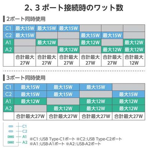 | ・差込口仕様:Aタイプ 2ピン ・差込口個数:3個口 ・差込口間隔:27mm(差込口中心間寸法) ・プラグ仕様:Aタイプ 2ピン ・ACコード長:約0.5m ・USB端子形状:USB Type-C(TM)ポート×2、USB-Aポート×2 ・AC側定格:14A 125V 1400Wまで ・USB側定格入力:AC100V-125V 50/60Hz 1A ・USB側定格出力(1ポート使用時):USB Type-Cポート:USB Power Delivery 20W(5V/3A、9V/2.22)、USB-Aポート:12W(5V/2.4A) ・USB側定格出力(2ポート使用時):USB Type-Cポート+USB Type-Cポート:合計27W(5V/5.4A)(各USB Type-C 15W(5V/3A))、USB Type-Cポート+USB-Aポート:合計27W(5V/5.4A)(USB Type-C 15W(5V/3A)、USB-A 12W(5V/2.4A))、USB-Aポート+USB-Aポート:合計12W(5V/2.4A)(各USB-A 12W(5V/2.4A)) ・USB側定格出力(3ポート使用時):USB Type-Cポート+USB Type-Cポート+USB-Aポート:合計27W(5V/5.4A)(各USB Type-C 15W(5V/3A)、USB-A 12W(5V/2.4A))、USB Type-Cポート+USB-Aポート+USB-Aポート:合計27W(5V/5.4A)(USB Type-C 15W(5V/3A)、各USB-A 12W(5V/2.4A)) ・USB側定格出力(4ポート使用時):USB Type-Cポート+USB Type-Cポート+USB-Aポート+USB-Aポート:合計27W(5V/5.4A)(各USB Type-C 15W(5V/3A)、各USB-A 12W(5V/2.4A)) ・極性対応:差込口は対応、プラグは目印のみ ・スイッチ:無 ・雷ガード:有 ・ホコリシャッター:有(AC差込口のみ) ・抜け止め機能:無 ・通電表示ランプ:無 ・二重構造:有 ・二重被ふく:有 ・絶縁キャップ付きプラグ:有 ・スイングプラグ:有(180度展開) ・マグネット:無 ・吊り穴:無 ・ブレーカー:無 ・ノイズフィルター:無 ・モジュラージャック:無 ・連動機能:無 ・変換アダプター:無 ・カラー:ホワイト ・材質:ポリカーボネート樹脂、PVC樹脂、ユリア樹脂、黄銅、銅 ・外形寸法:幅約33mm×奥行約210mm×高さ約28mm ※コードや突起部を除く本体のみ ・質量:約221g ・環境配慮事項:THINK ECOLOGY対応製品 ・使用可能地域:日本国内専用 ・規格:USB Power Delivery対応 ・法規:PSE 特定電気用品 ・保証期間:1年間 |