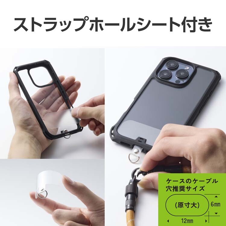 ●ケースにストラップホールがなくても、付属のストラップホールシートをスマートフォンとケースの間に挟むだけで使用できます。