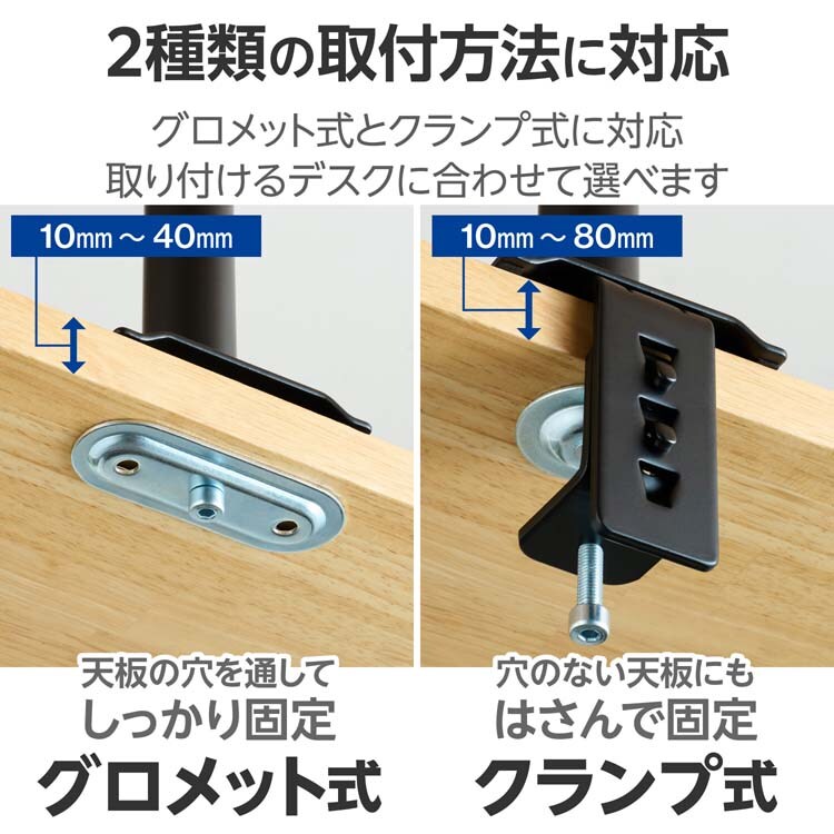 ●デスクの天板に挟んで固定するクランプ式と、天板に穴を開けてボルトを通して固定するグロメット式の2通りの取り付け方法が選べます。