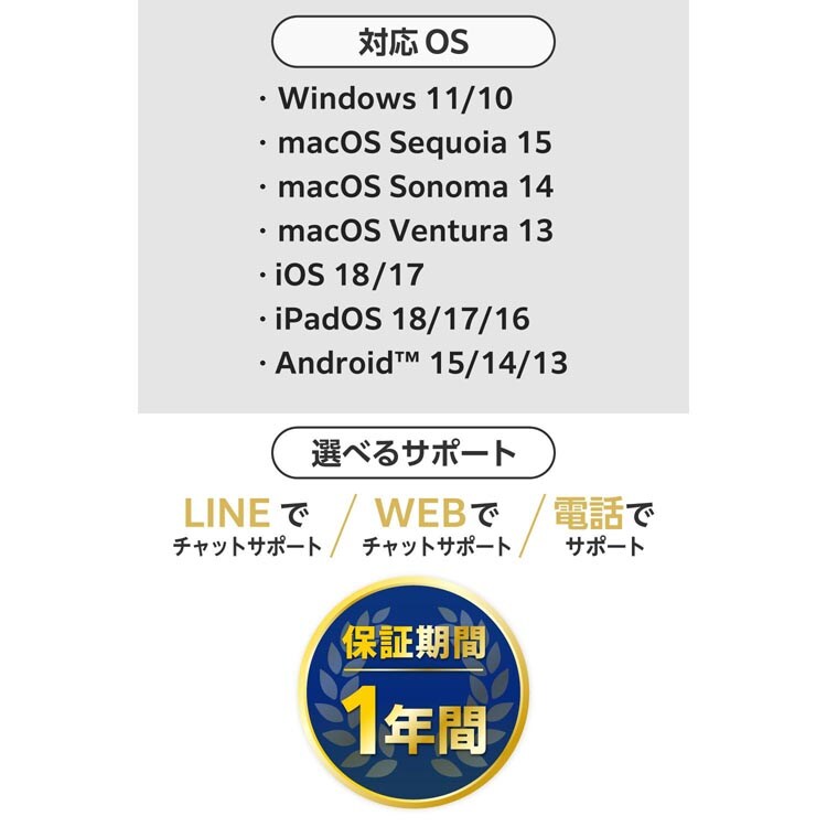 | ・対応OS(Windows):Windows 11/10 ・対応OS(macOS):macOS Sequoia 15/macOS Sonoma 14/macOS Ventura 13 ・対応OS(iOS):iOS 18/17 ・対応OS(iPadOS):iPadOS 18/17/16 ・対応OS(Android):Android 15/14/13 |