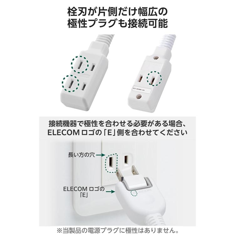 ●接続機器で極性を合わせる必要がある場合、コンセントの長い方の穴と電源プラグにあるELECOMロゴ(ELECOMとだけ書かれている面)の頭文字「E」側を合わせて挿し込んでください。