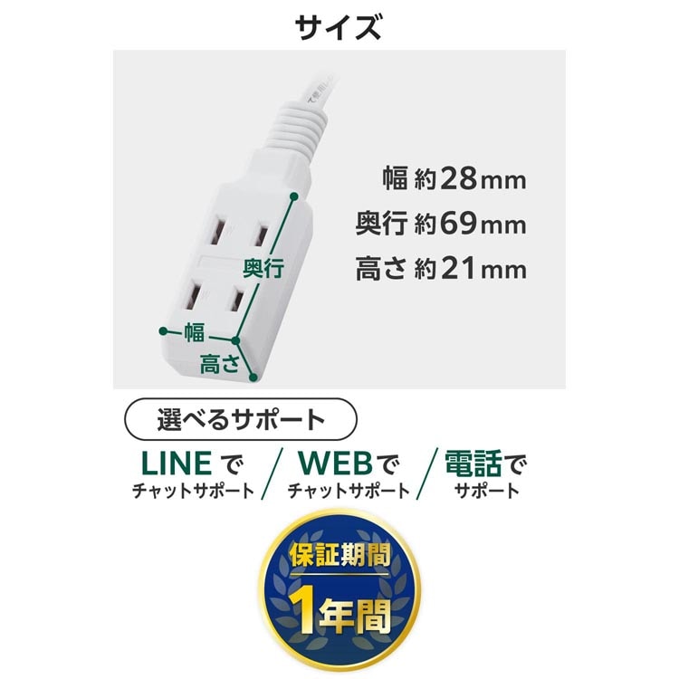 | ・差込口仕様:2ピン ・差込口個数:3個口 ・差込口間隔:22mm(2個口側差込口中心間寸法) ・プラグ仕様:2ピン ・ACコード長:2m ・定格:15A、125V、合計1500Wまで ・極性対応:あり ・スイッチ:無し ・雷ガード:無し ・ホコリシャッター:無し ・抜け止め機能:無し ・差込口キャップ:無し ・通電表示ランプ:無し ・二重構造:無し ・二重被ふく:あり ・絶縁キャップ付きプラグ:あり ・スイングプラグ:あり ・マグネット:無し ・吊り穴:無し |