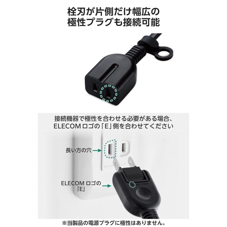 ●接続機器で極性を合わせる必要がある場合、コンセントの長い方の穴と電源プラグにあるELECOMロゴ(ELECOMとだけ書かれている面)の頭文字「E」側を合わせて挿し込んでください。