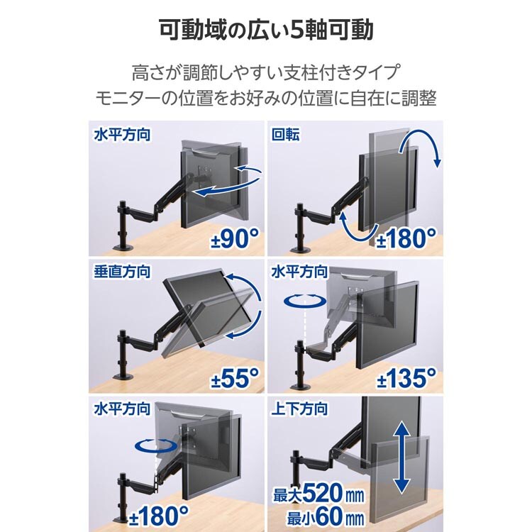●可動域の広い5軸可動のアームタイプで、高さが調節しやすい支柱付きです。