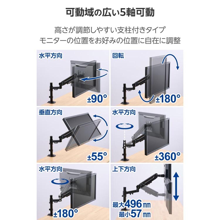 ●可動域の広い5軸可動のロングアームタイプで、高さが調節しやすい支柱付きです。