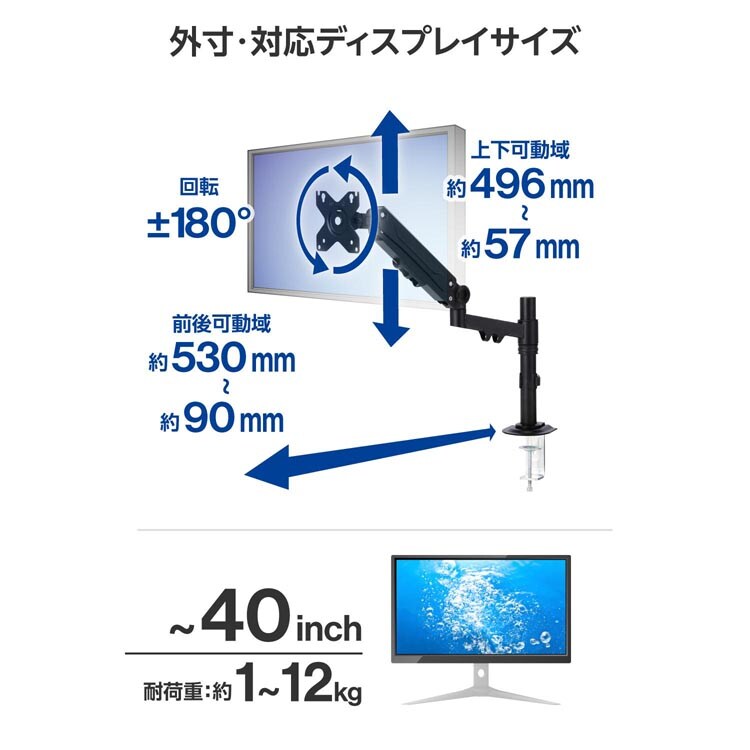 ●40インチサイズまでのモニターに対応する、ロングアームのメカニカルスプリング式シングルモニターアームです。