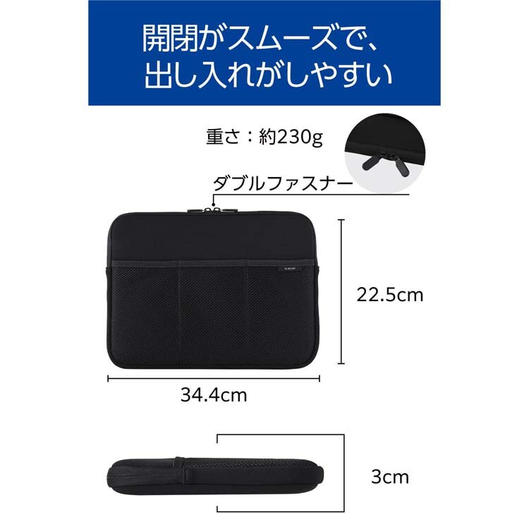 | ・外形寸法:W約344mm×H約255mm×D約30mm ・内寸:W約308mm×H約220mm×D約18mm ※参考収納寸法 ・重量:約230g ・材質:ポリエステル、クロロプレンゴム ・カラー:ブラック ・対応モデル:~13.3インチまでのノートパソコン ・ポケット(前面):メッシュポケット×3 ・その他:撥水加工(表生地) |