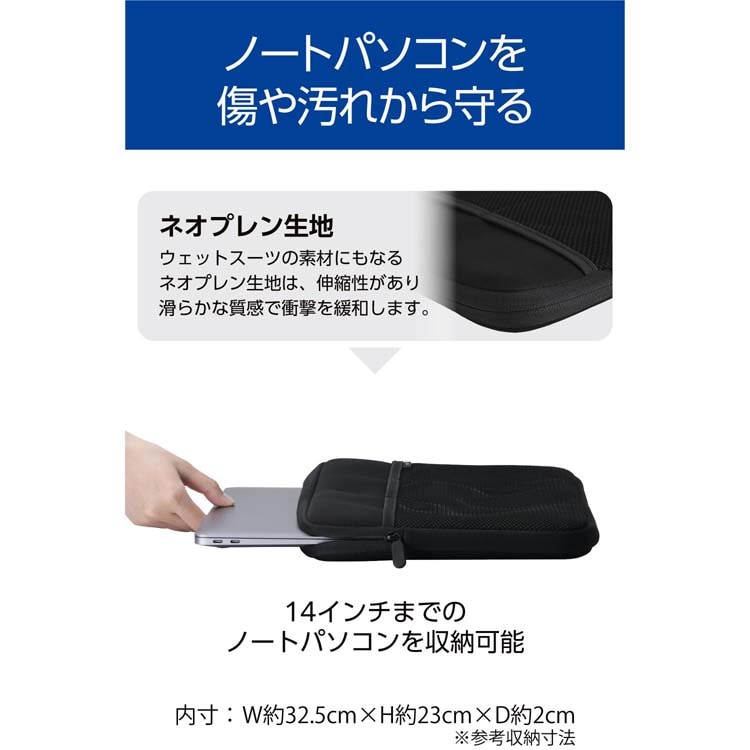 | ・外形寸法:W約356mm×H約260mm×D約30mm ・内寸:W約325mm×H約230mm×D約20mm ※参考収納寸法 ・重量:約250g ・材質:ポリエステル、クロロプレンゴム ・カラー:ブラック ・対応モデル:~14.0インチまでのノートパソコン ・ポケット(前面):メッシュポケット×3 ・その他:撥水加工(表生地) |