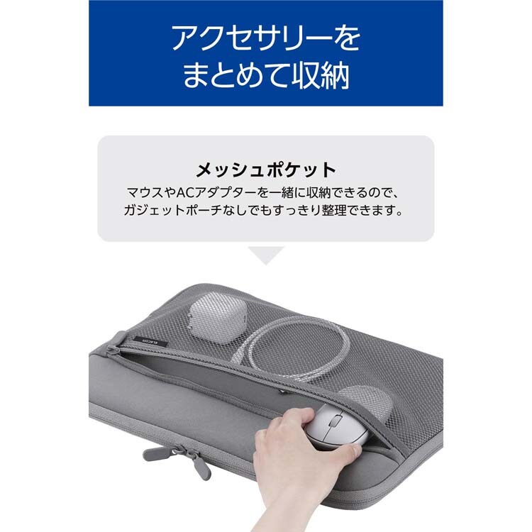 ●マウスやACアダプターを一緒に収納できるメッシュポケット付き。ガジェットポーチなしでもすっきり整理できます。