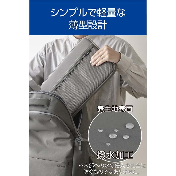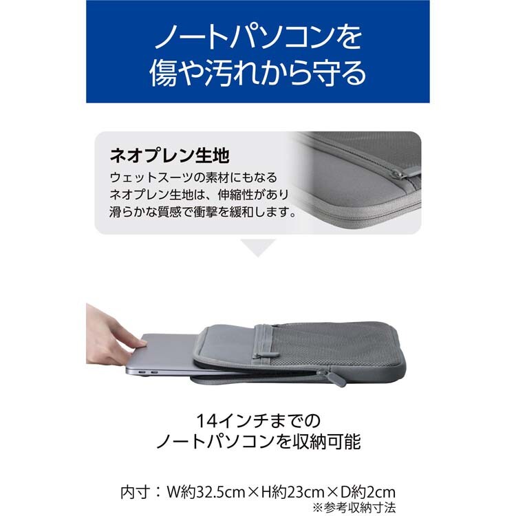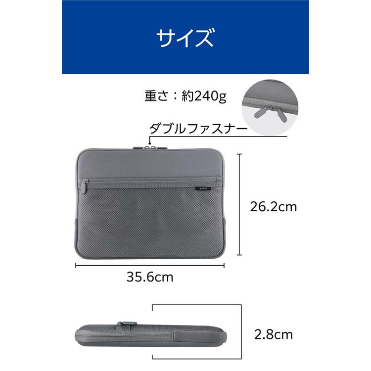 | ・外形寸法:W約356mm×H約262mm×D約28mm ・内寸:W約325mm×H約230mm×D約20mm ※参考収納寸法 ・重量:約240g ・材質:ポリエステル、クロロプレンゴム ・カラー:グレー ・対応モデル:~14.0インチまでのノートパソコン ・ポケット(前面):メッシュファスナーポケット×1 ・その他:撥水加工(表生地) |