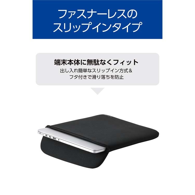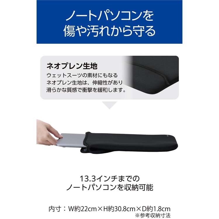| ・外形寸法:W約242mm×H約338mm×D約16mm ・内寸:W約220mm×H約308mm×D約18mm ※参考収納寸法 ・重量:約170g ・材質:ポリエステル、クロロプレンゴム ・カラー:ブラック ・対応モデル:~13.3インチまでのノートパソコン ・その他:撥水加工(表生地) |
