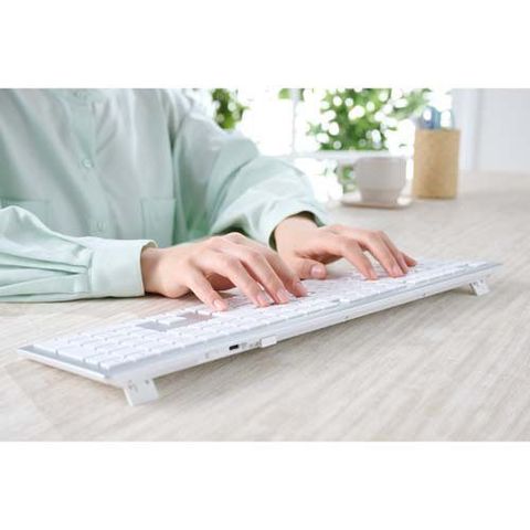 ●複数のデバイスをひとつのキーボードで操作可能。最大4台のデバイスに接続できる、マルチペアリングに対応しています。Bluetooth(R)接続で3台、USB無線2.4GHzで1台まで接続機器を本体に保存でき、使用シーンに合わせてデバイスを瞬時に切り替えられます。