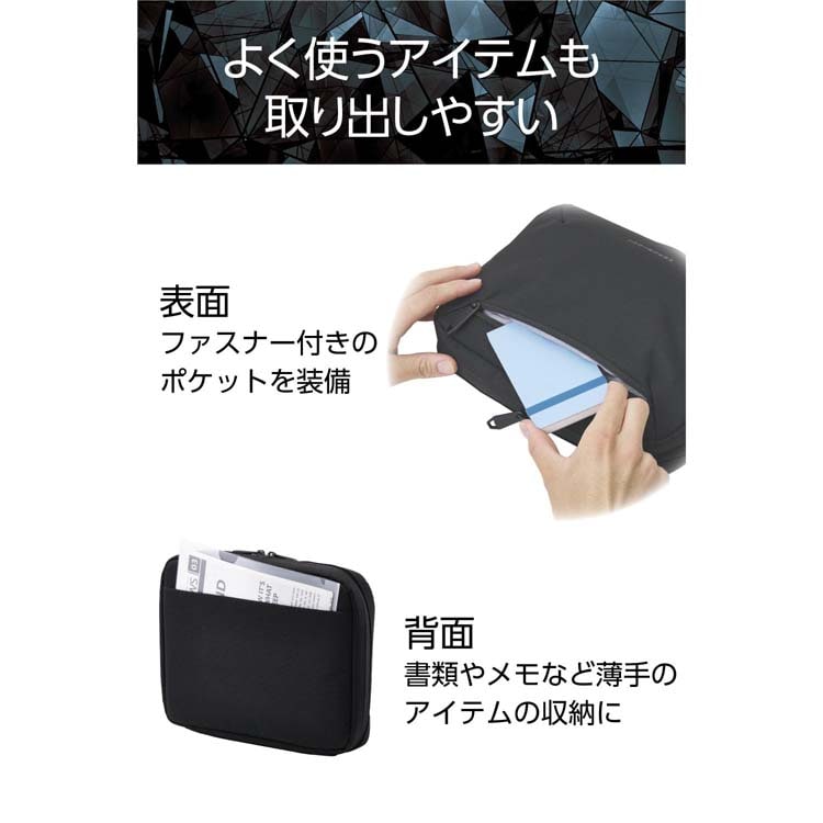 ●表面にファスナーポケットを装備。外側にあるためサッと取り出しやすく、よく使うアイテムの収納に便利です。