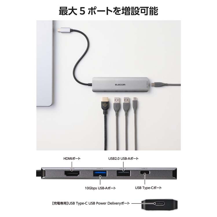 ●USB Type-Cポート搭載パソコンに最大5ポートを増設可能。さまざまなデバイスを1本のケーブルで一括接続できます。