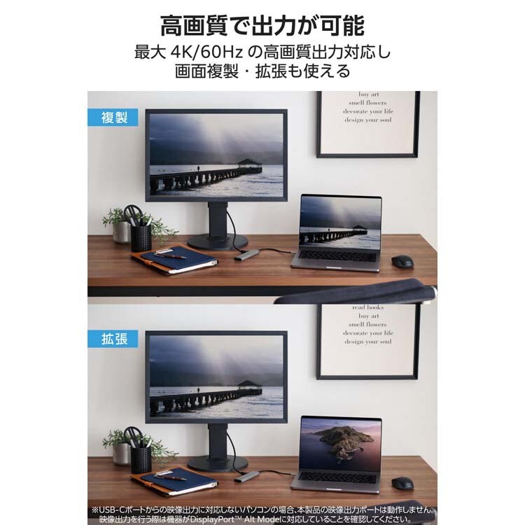 ※USB Type-Cコネクターからの映像出力に対応しないパソコン本体の場合、本製品の映像出力ポートは動作しません。映像出力を行う際は機器がDisplayPort Alt Modeに対応している必要があります。