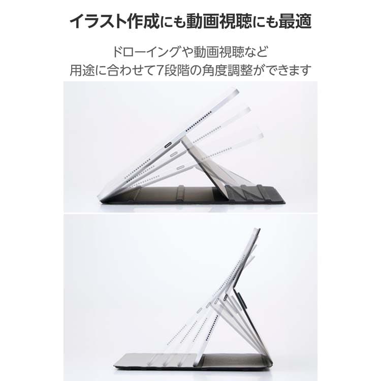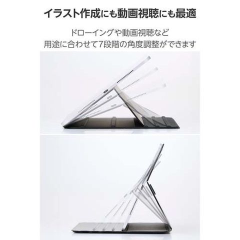 ●背面ケースを折り曲げて端末装着部を支えることで、動画視聴やタイピング、ドローイングなどのシーンに合わせて7段階の角度調整が可能です。