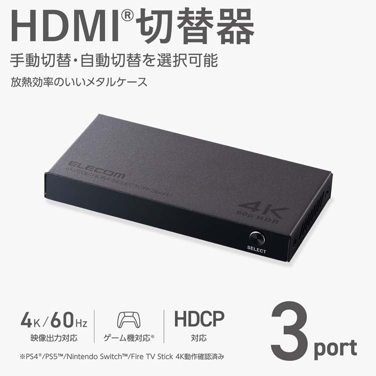 ●HDMI(R)ポート不足を解消して、3台のHDMI機器をボタン一つで切り替えできるHDMI切替器です。4K60Hz、HDR、HDCP2.2対応でゲーミングやホームシアター環境構築におすすめです。手動切り替えで思わぬ誤作動を防止し、自動切り替え機能も搭載(ON/OFF可能)しています。メタル筐体で放熱性も高いです。PS5(TM)、NINTENDO SWITCH(TM)、Fire TV Stick 4Kに対応しています。