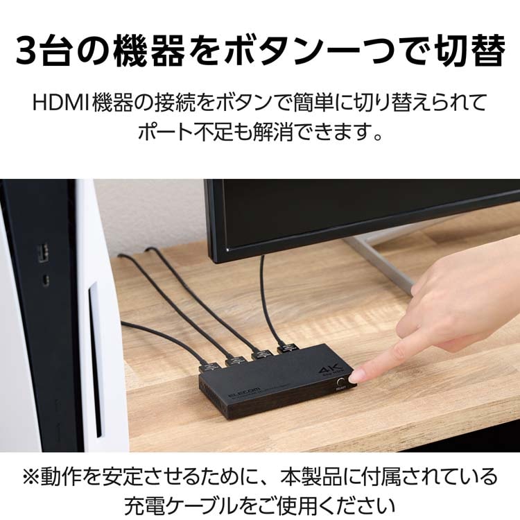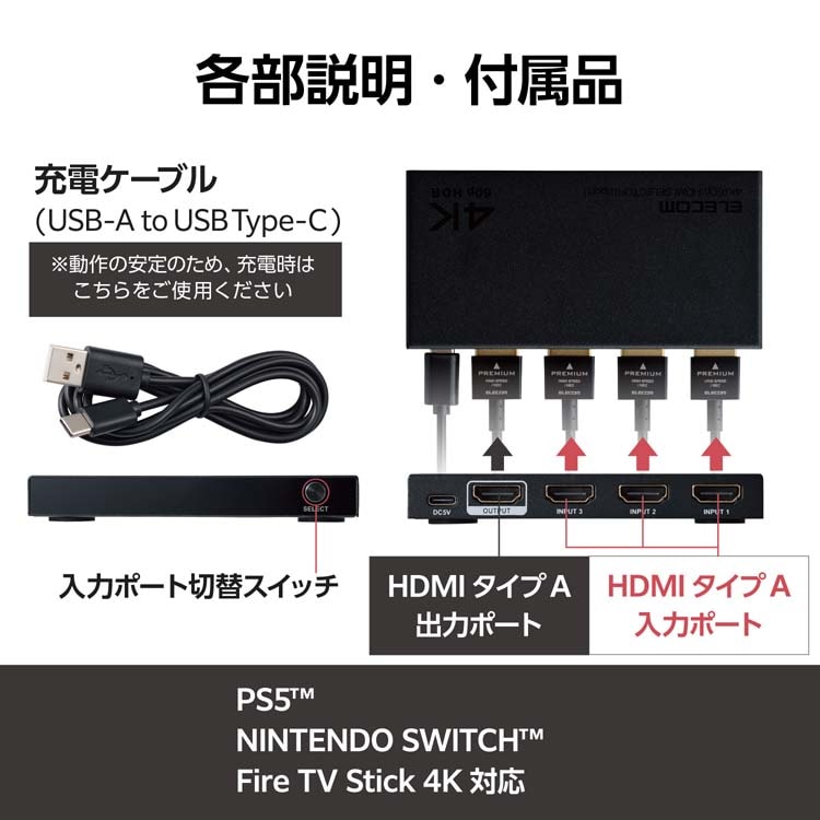 | ・最大出力解像度:4K(4096×2160) 60Hz ・主な対応解像度:4K(4096×2160) 30Hz/60Hz、4K(3840×2160)30Hz/60Hz、2K(1920×1080) 60Hz、1080i/720p/576p/576i/480p/480i ・対応音声フォーマット:Dolby Digital 2.0ch/5.1ch、Dolby Digital Plus 2.0ch/5.1ch/7.1ch、Dolby True HD 2.0ch/5.1ch/7.1ch、DTS5.1ch、DTS HD5.1ch、LPCM2ch(最大24bit 192kHz) ・HDMI規格:HDMI(R)2.0 ・HDR:HDR10、Dolby Vision(R)、HLG対応 ・データレート:18Gbps ・対応映像出力機器:HDMI出力端子を搭載したAV機器・家庭用ゲーム機・メディアストリーミング端末・パソコンなど ・対応映像表示機器:HDMI入力端子を搭載したテレビ・ディスプレイ・プロジェクターなど ・ポート数:入力:3、出力:1 ・コネクター形状:入力:HDMI タイプA 19ピン(ポート)×3、出力:HDMI タイプA 19ピン(ポート)×1、電源:USB Type-C(TM)(ポート) ・許容ケーブル長:入出力側共に5m以内(2K解像度までは「High Speed HDMIケーブル」を、4K解像度では「Premium HDMIケーブル」をご使用ください。) ・HDCP:HDCP1.4/2.2/2.3対応 ・CEC:対応 ・HEC:非対応 ・ARC:非対応 ・適合規格:VCCI Class B ・定格:DC 5V[ケーブル長 約1.1m ※コネクター含まず](充電ケーブル) ・消費電流:1A ・材質:メタル ・サイズ:幅約112.3mm×奥行約56.6mm×高さ約14.5mm ※ゴム足含まず ・重量:約141g(本体) ・カラー:ブラック ・使用温度・湿度:温度0~40度、湿度10~80%(結露なきこと) ・保存温度・湿度:温度-10~60度、湿度5~90%(結露なきこと) ・保証期間:1年間 ・パッケージ:紙箱 |