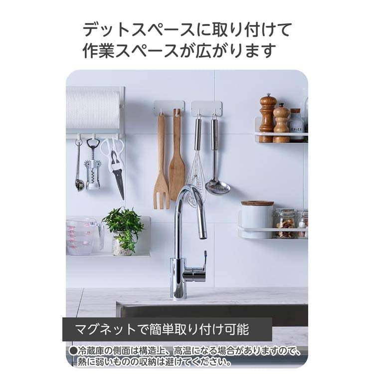 ●壁面や冷蔵庫の側面などにマグネットで簡単に取り付け可能。デッドスペースを有効活用することで、キッチンの作業スペースが広がります。