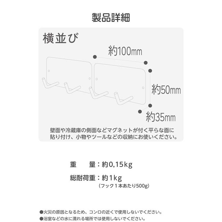| サイズ:幅約100mm×奥行約35mm×高さ約50mm(1個あたり) 重量:約0.15kg 材質:スチール、マグネット、シリコン 耐荷重:総耐荷重: 約1kg(フック1本あたり500g) カラー:ホワイト |