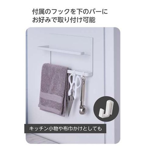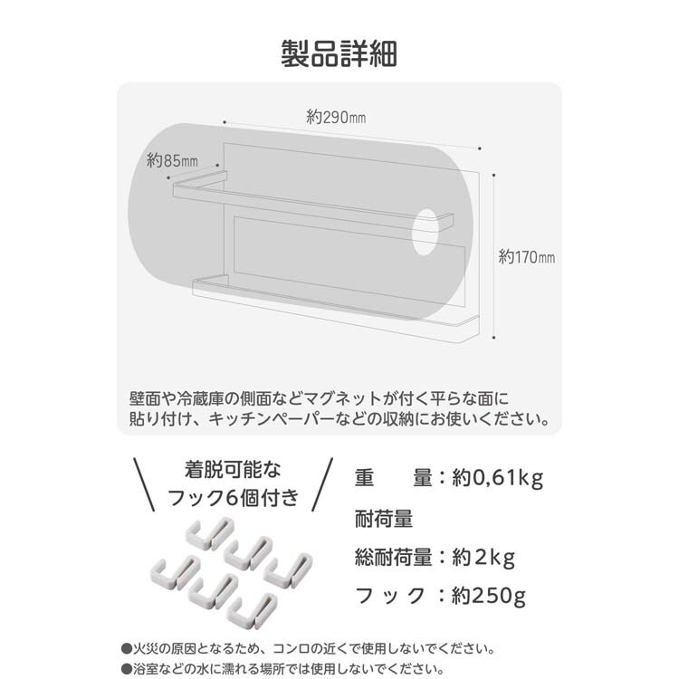 | サイズ:幅約290mm×奥行約85mm×高さ約170mm 重量:約0.61kg 材質:スチール、マグネット、シリコン、PP 耐荷重:総耐荷重:約2kg、フック:約250g カラー:ホワイト |
