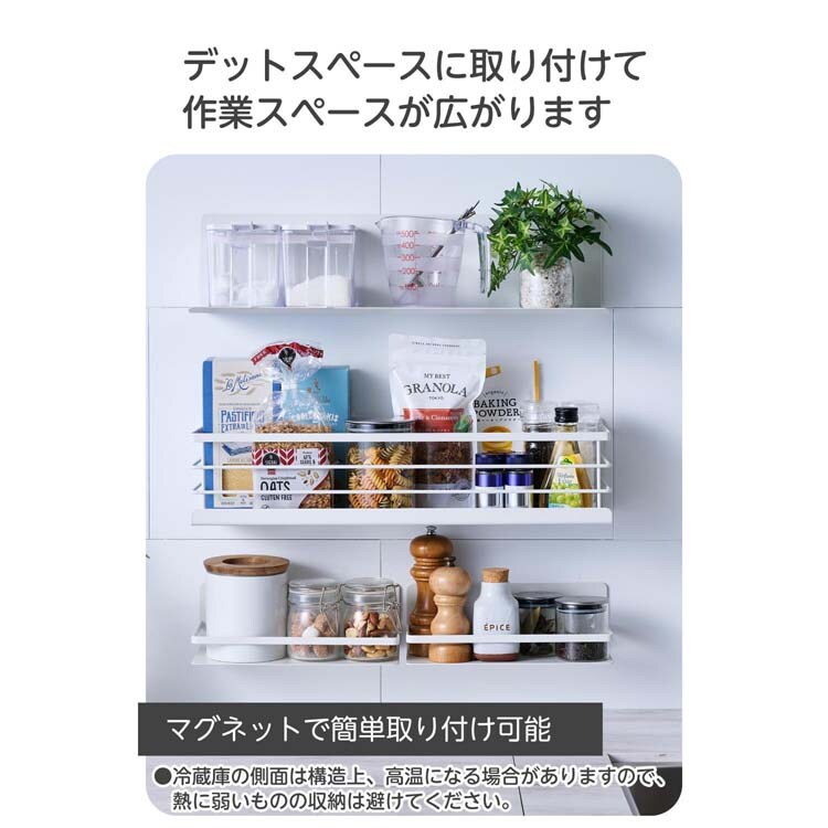 ●壁面や冷蔵庫の側面などにマグネットで簡単に取り付け可能。デッドスペースを有効活用することで、キッチンの作業スペースが広がります。