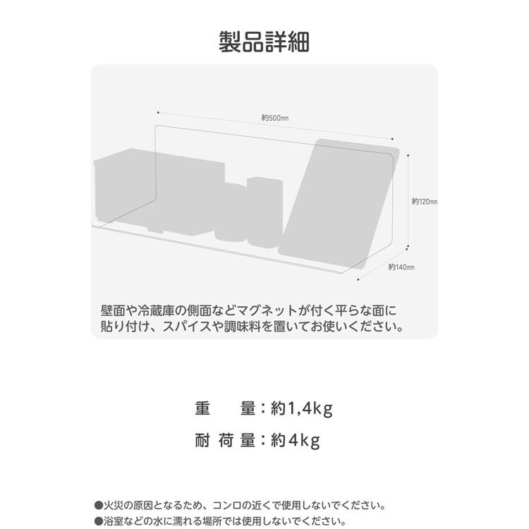 | サイズ:幅約500mm×奥行約140mm×高さ約120mm 重量:約1.4kg 材質:スチール、マグネット、シリコン 耐荷重:約4kg カラー:ホワイト |